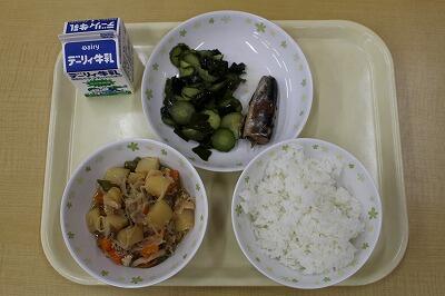 今日の給食は、「ご飯、さつま汁、いわし梅煮、切り干し大根の炒め物」でした。おいしかったです。ごちそうさまでした!