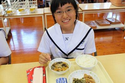 今日の給食は、「ご飯、豆乳味噌汁、焼肉炒め」でした。豆乳味噌汁は初めていただきました。美味しいと思いました。