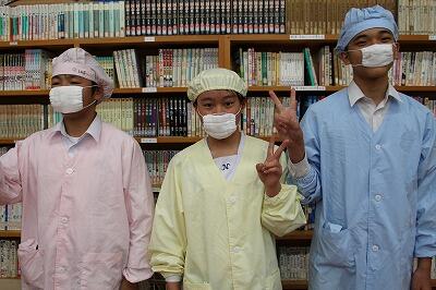 西岳中学校の給食着は、ピンクが1年生、黄色が2年生、水色が3年生です。学年毎に色の違う給食着もめずらしい!?