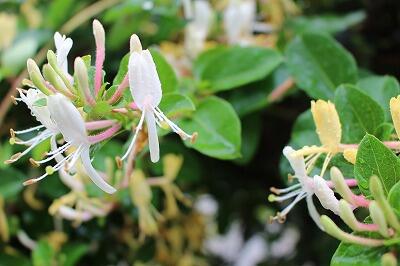 5月から6月にかけて、野山では白い花が目立つのはなぜでしょうか?卯の花の白い花があちこちで見られます。この花は、西岳中学校と小学校の境のフェンスに咲き誇っている花です。近くを通ると甘酸っぱい臭いがします。たしかスイカズラの花ではないかと思います。この時期を代表する野草だと思います。