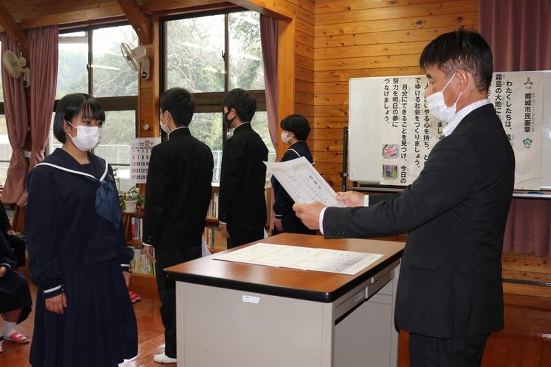 2月8日(月)立志式が行われました。例年は、夏尾中と合同開催でしたが、本年度は感染症防止対策のため、単独での開催となりました。式典では、立志を迎えた生徒による「立志の誓い」が行われ、漢字1文字に込められた思いやこれからの夢等を発表しました。