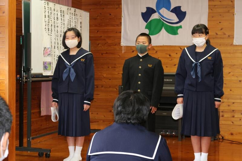 3月26日(金)修了式が行われました。この一年間コロナで始まり、コロナで終わる年になりましたが、そんな中でも全校生徒17名で力を合わせて日々の学校生活を頑張りました。校長先生が作られたスライドを見ながら、今年一年を振り返りました。