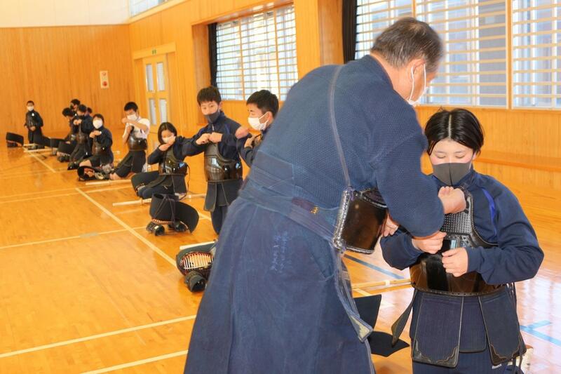 スクールサポーターの横山先生をお招きし、保体「剣道」の授業を行いました。本日(1月29日)は第2回目、防具のつけ方、足さばき、素振り等の基本的な動作の仕方について学びました。1月から2月にかけて5時間来校していただき、専門的な立場から指導していただきます。