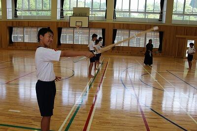 体育の授業は、器械体操をしています。まず柔軟体操から始めて安全に注意しています。きつい柔軟運動も楽しく取り組んでいます。西岳中学校の生徒は、何でも一生懸命取り組むところが素晴らしいですね!