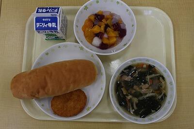 今日の給食のメニューは、「コッペパン、きのことほうれん草のスープ、日向鶏コロッケ、フルーツ白玉」でした。生徒たちはフルーツ白玉が大好きですね。おいそうに食べていました。