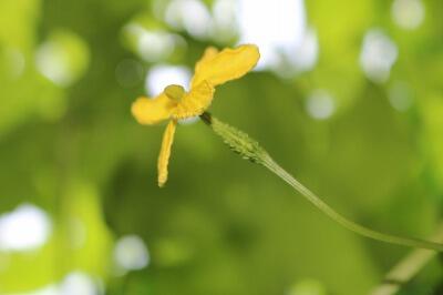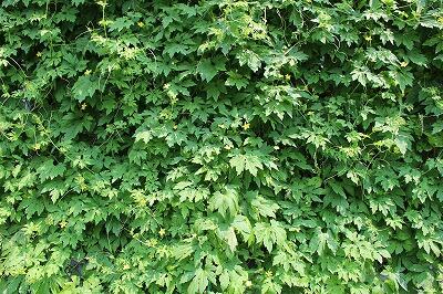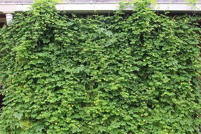 肥料が効いてきたのでしょうか?緑のカーテンは葉が繁ってほぼ完成に近づきました。昨年は台風で飛ばされてしまったそうです。今年も台風が心配です。現在、雌花は四つ確認されています。最初のものはもうずいぶん大きくなりました。
