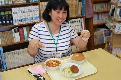 今日の給食のメニューは、「コッペパン、ミネストローネ、牛肉コロッケ、ゆで野菜」でした。今日の給食紹介はこの方です!!初めて先生登場です。いいですね~!