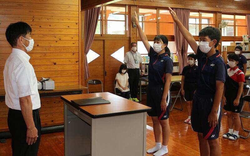 7月30日(木)中体連大会推戴式が行われました。選手一人ひとりから「悔いの残らぬように」「あきらめない」「気持ちで負けない」「笑顔で声掛け」等の力強い決意表明の後、校長先生から「これまで支えてくれた方々に感謝の気持ちを忘れず、練習の成果を出し切ってください。」と激励の言葉をいただきました。
