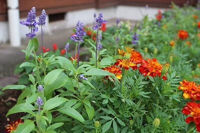 中庭の花壇では、夏に植えた花が咲き始めています。ブルーサルビアが花をつけ始めました。