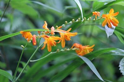 今、小学校との境目の斜面にオレンジ色の蘭の花?が咲いています。調べてみると「モントブレチア」?時折見かける花ですが、名前がはっきり分かりません。