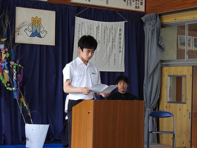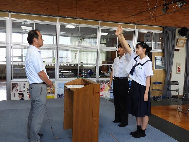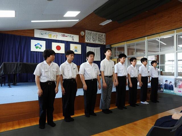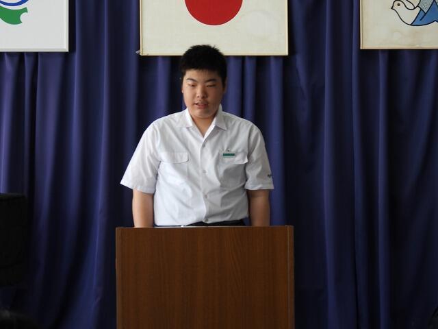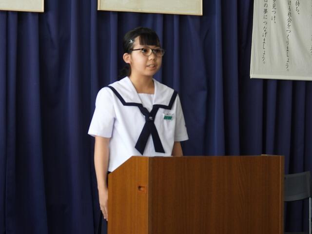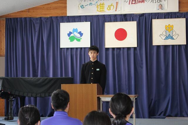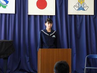 1年生代表Nさんは、運動会で奴踊りに挑戦したことや学級委員長としてコミュニケーション能力を高め、リーダーシップを身に付けたいと発表してくれました。