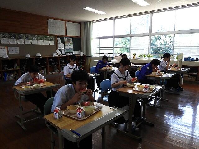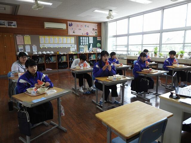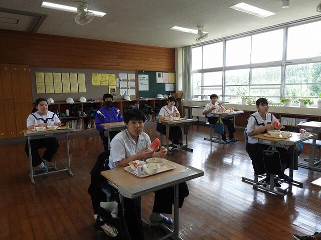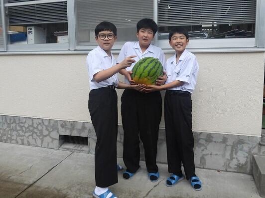 7月15日(火)、先日、地域の方から頂いた大きなスイカを給食の時間に食べました。とっても甘くて、美味しいスイカでした。ありがとうございました。