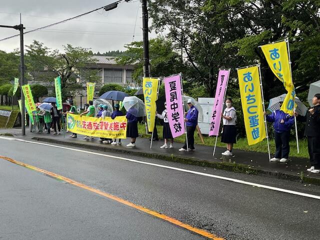 7月14日(月)西岳地域安全協議会、夏尾・御池地区青少年育成協議会主催の「あいさつ運動・交通安全啓発活動」を7:30から夏尾小学校前で行いました。行き交うドライバーの皆さんに安全運転を意識してもらえるよう、大きな声であいさつをする姿が見られました。