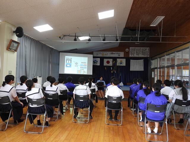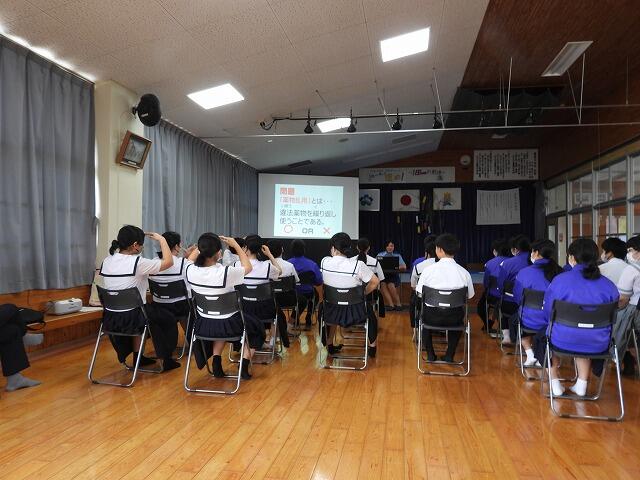7月15日(火)6校時に都城警察署から講師をお招きして、薬物乱用防止教室を実施しました。大麻や覚せい剤などの禁止薬物が、SNSを通じて簡単に取引され、身近に迫っていることや薬局で買える薬の過剰摂取(オーバードーズ)が問題になっていること等を学びました。正しい知識を身に付け、誘惑を断る強い意志を持ちましょう。