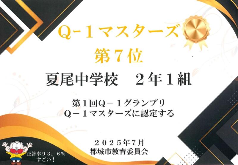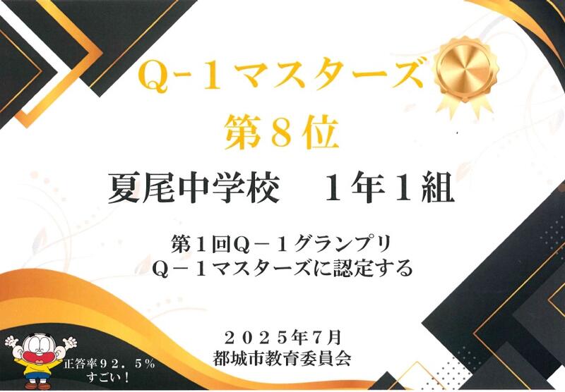 6月23日(月)に実施した「第1回Q-1グランプリ」の結果が返されました。結果は、全学年『Q-1マスターズ』に認定されました。Q-1グランプリとは、都城市内の小学5年生~中学3年生がQubenaというデジタル教材を使って算数のプレ問題に取り組み、各学校が設定した時間にテストを実施して、クラスごとに集計して、正答率を出します。上位20位までのクラスを『Q-1マスターズ』として認定します。都城市内の小学5年生~中学3年生までの学級数は、250を超えます。そんな中、夏尾中は、全学年10位以内というのは素晴らしい結果です。「第2回Q-1グランプリ」は、9月に実施されます。次も『Q-1マスターズ』目指して、全校で取り組んでいきましょう。