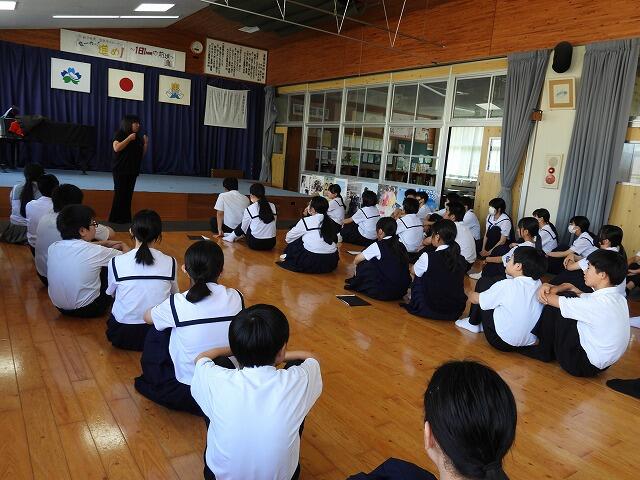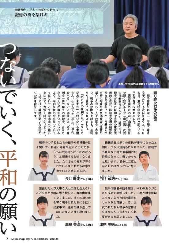 広報都城8月号の特集「戦後80年、平和への誓いを新たに・記憶の橋を架ける」に、7月8日に夏尾中で実施した平和学習会の記事が掲載されています。平和学習会の様子や生徒4名の感想などが紹介されています。是非、ご一読いただいて、平和について考える機会にしてください。なお、以下の写真等は、都城市秘書広報課の許可を頂いて掲載しています。