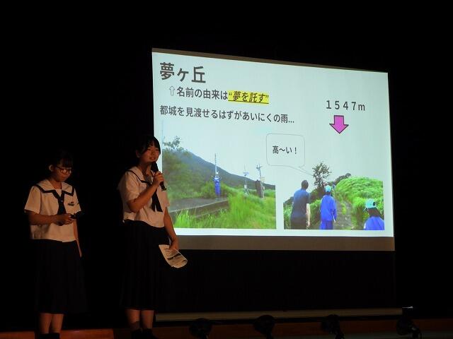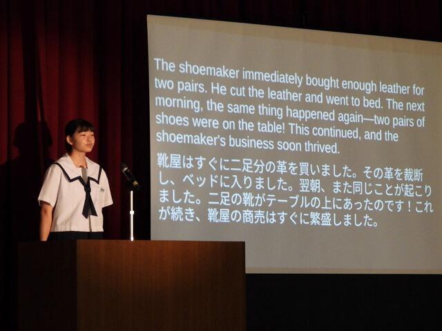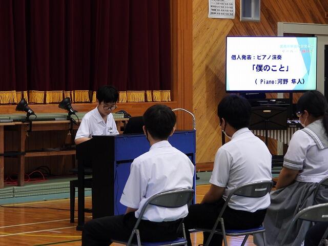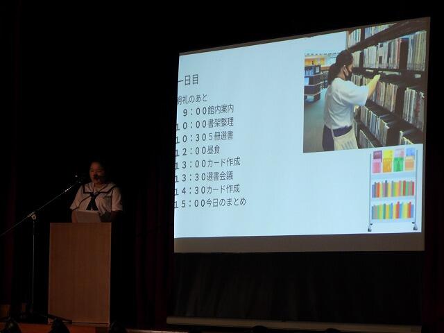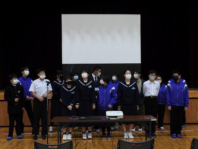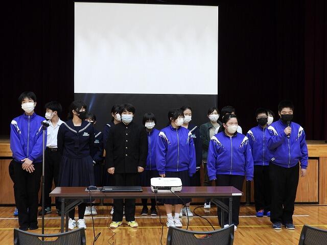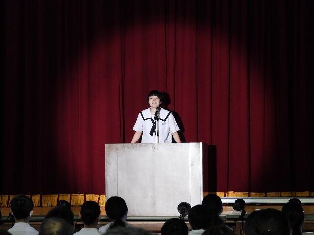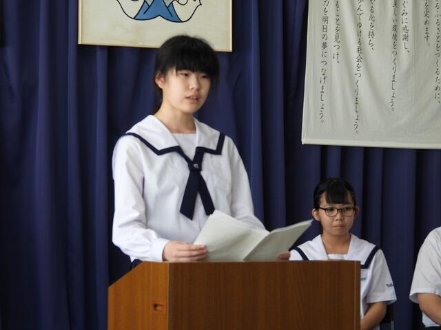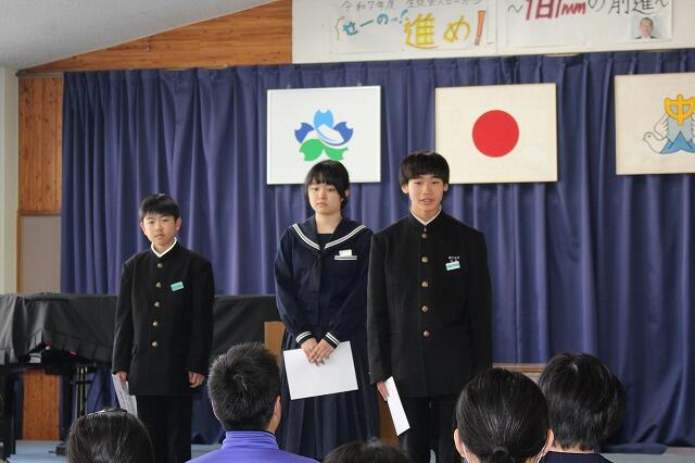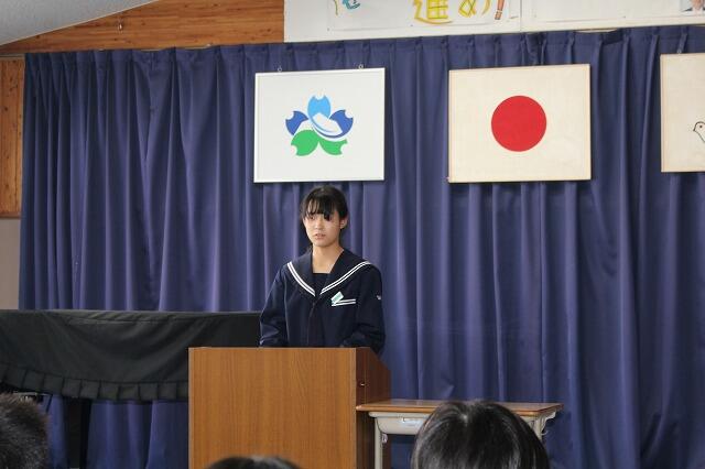 2年生代表Mさんは、小中合同運動会で絆を深めることができたことや部活動で県大会に出場できて嬉しかったことなどを発表してくれました。