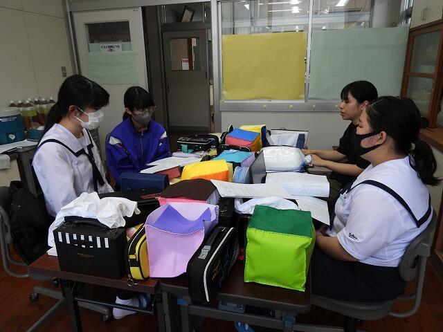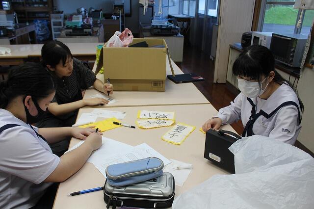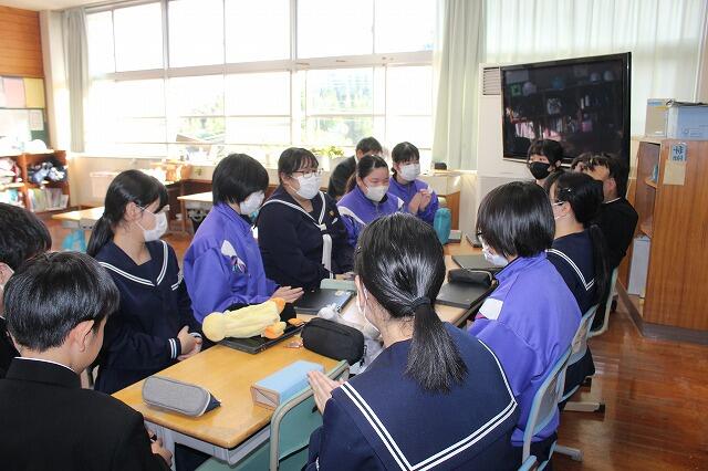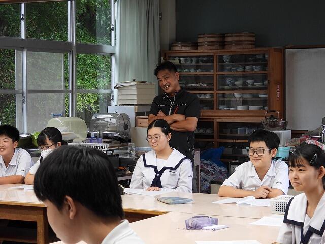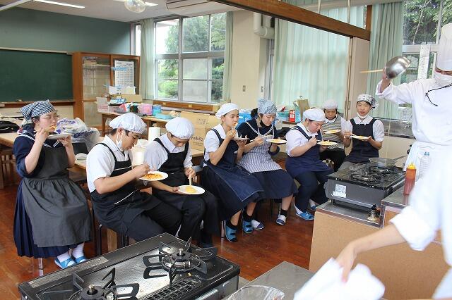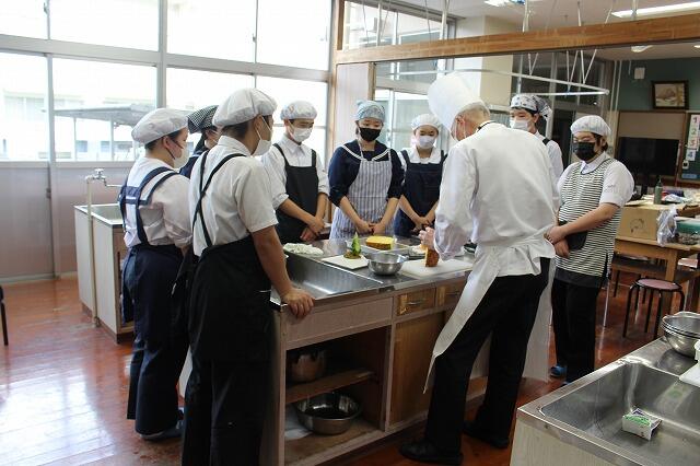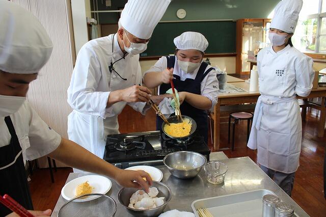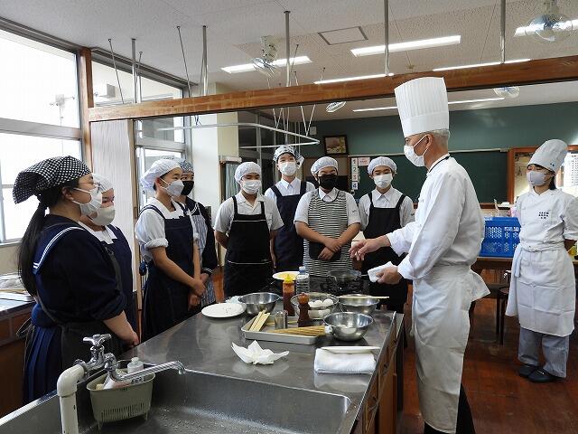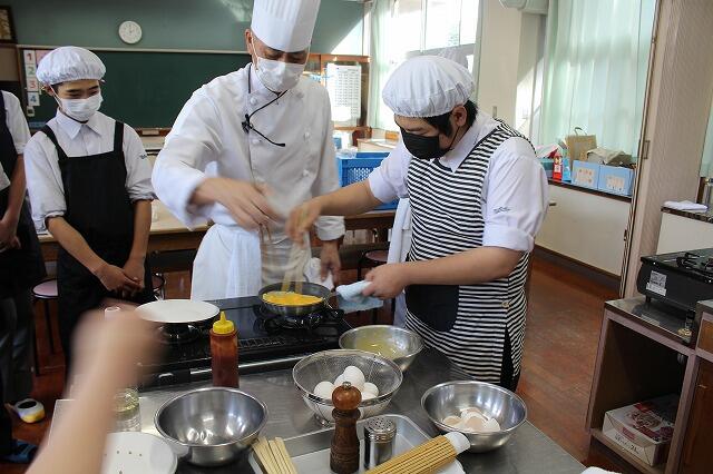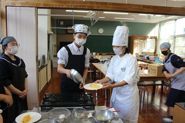 10月30日(木):5・6校時に2年生家庭科の授業で、日章学園高校の出前講座を実施しました。調理科の先生の指導のもと、プレーンオムレツ作りを体験しました。プレーンオムレツは、20秒が勝負で、30秒かかったら失敗だそうです。生徒は、手早くを意識しながら、上手に仕上げていました。また、オレンジとパイナップルの切り方も教えていただきました。