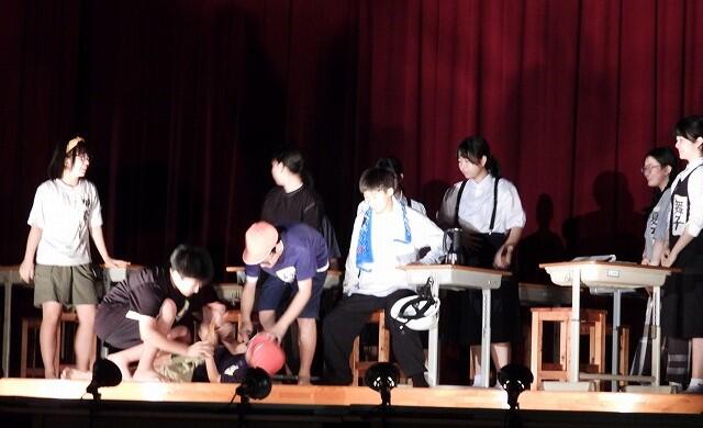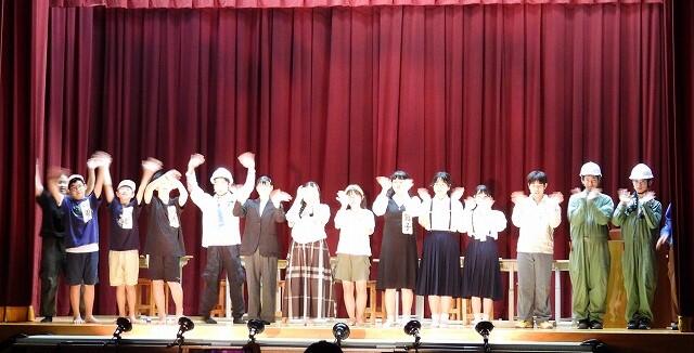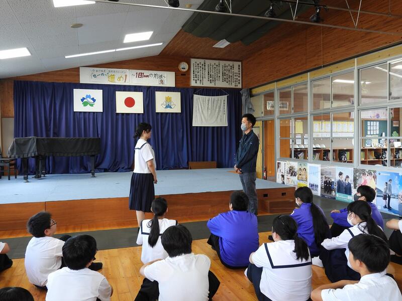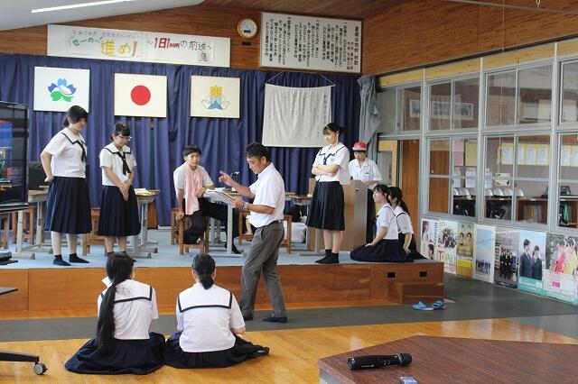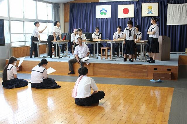 9月4日(木):6校時に開催予定の学校保健委員会が、台風接近のため延期となったので、学習発表会で発表する劇の練習を行いました。今年は、国語科の鶴田先生の脚本・演出のもと、全校生徒が参加して『学校童子』という劇にチャレンジします。どのような劇に仕上がるか【10月12日(日)】の学習発表会本番をご期待ください!!