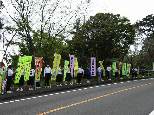 9月22日(月):西岳地域安全協議会、夏尾・御池地区青少年育成協議会主催の「第2回あいさつ運動・交通安全啓発活動」を7:30から夏尾小学校前で行いました。前回は、宮崎県中学校総合体育大会のため3年生は参加できませんでしたが、今回は多くの生徒が参加してくれました。小学生と一緒に大きな声であいさつする姿が見られました。