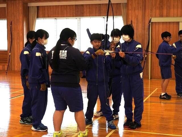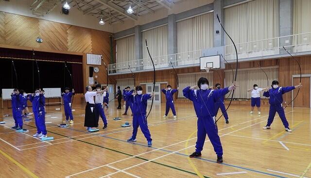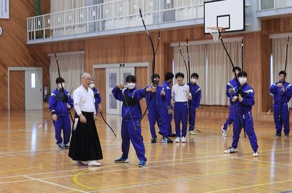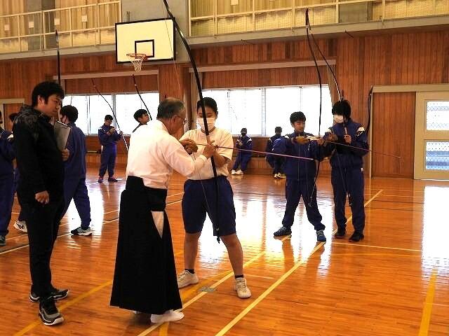 11月20日(木):1・2校時の保健体育で、宮崎県弓道連盟会長の重信和幸先生に指導していただき、弓道の授業(5回目)を実施しました。今年度、最後の弓道の授業でした。弓道の授業が、今年で3回目となる3年生は、所作も美しく、矢を射る姿も様になっていました。今年初めて弓道を習った1年生も、最後に矢を引かせてもらいました。重信先生、今年度もありがとうございました。