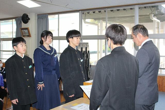 11月21日(金):新生徒会役員の任命式と旧生徒会役員の退任式がありました。これまで夏尾中を支え、リードしてくれた生徒会役員に感謝状が贈られ、新生徒会役員には、任命証が授与されました。3年生の生徒会役員の皆さんありがとうございました。新生徒会役員の皆さん、3年生の意思を引継ぎ、活気のある夏尾中学校にしていきましょう。