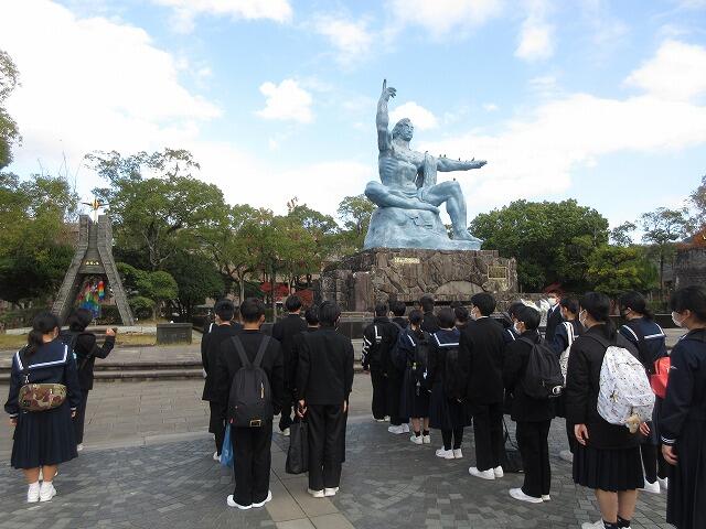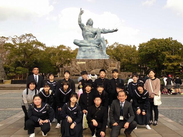 12月7日(日):本日から2泊3日の日程で、西岳中・笛水中と3校合同修学旅行に行きます。市場の駅セボンチマルシェで出発式を行い、熊本港へ向けて出発しました。本日は、長崎平和公園・原爆資料館で平和学習を行い、新門司港からフェリーで大阪南港に向かいます。楽しく、学びの多い3日間になりますように。