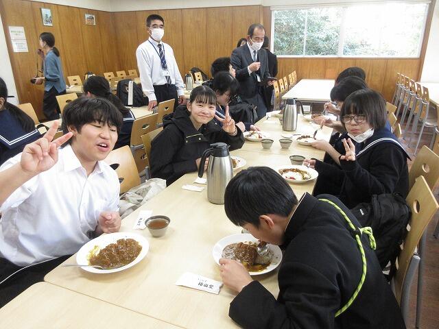 12月12日(金):3・4校時、西岳地区社会福祉協議会から6名来校していただき『地域料理教室』を実施しました。毎年、3年生を対象に実施しています。今回は、「タンドリーチキン・かぼちゃサラダ・トマトのスープ・フルーツポンチ」の4品を作りました。社会福祉協議会の皆さんの指導をもらいながら、手際よく調理する姿が見られました。出来上がった料理は、いろいろな話をしながら、美味しくいただきました。全員で後片付けも行いました。西岳地区社会福祉協議会の皆様、ありがとうございました。