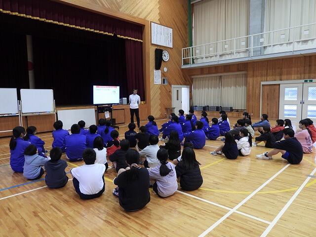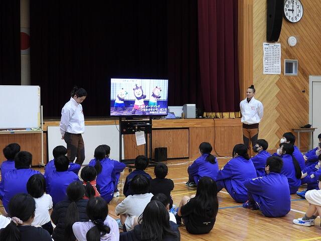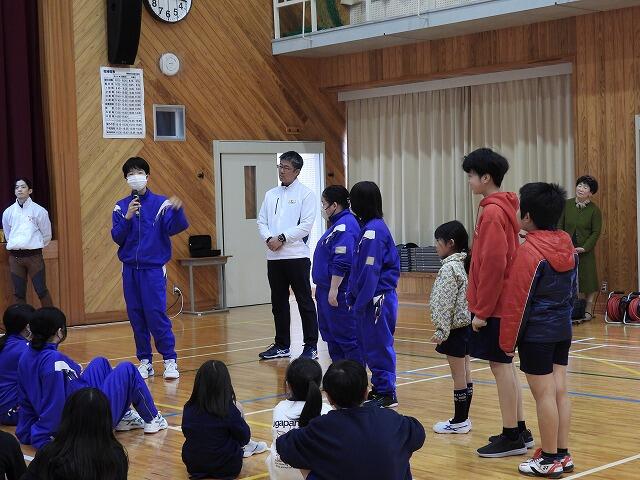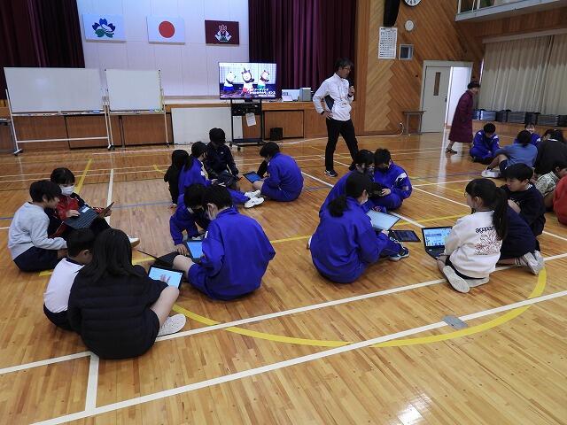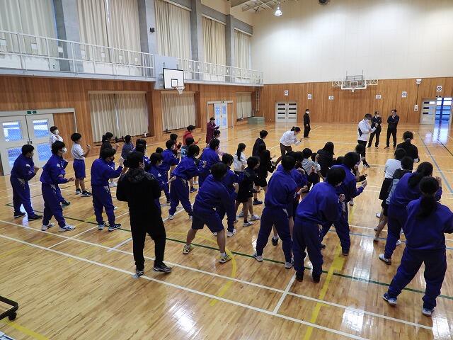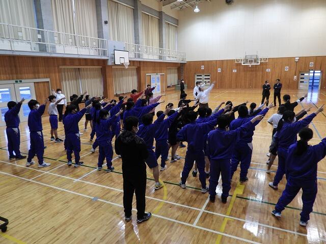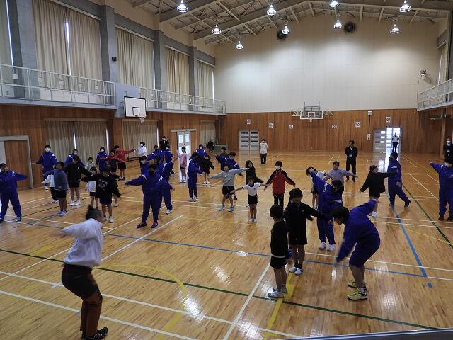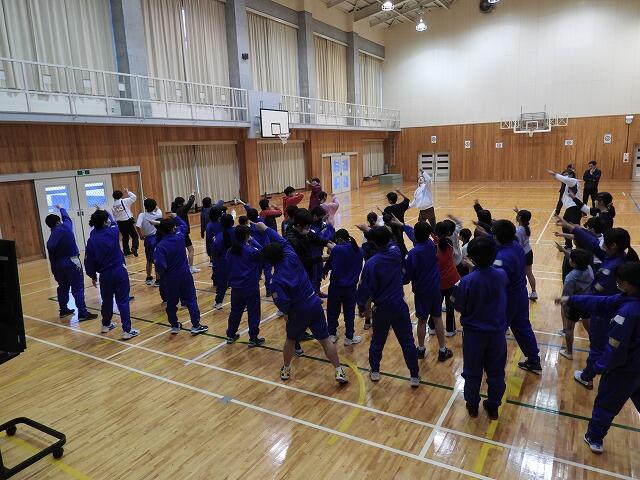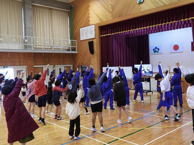 2月24日(火):宮崎国スポ・障スポ局&宮崎県女子体育連盟より5名の講師をお招きして、2027年に宮崎県で開催される「日本のひなた宮崎国スポ・障スポ」の大会イメージソング「ひなたのチカラ」ダンス教室を夏尾小と合同で開催しました。基本の振付指導の後、グループに分かれて創作ダンス制作、動画撮影、動画視聴の流れで実施しました。創作ダンスでは、各競技の動きを取り入れたダンスを小学生・中学生で協力して考え、オリジナルのダンスを作り上げることができました。とても楽しい取り組みになりました。5名の講師の先生方ありがとうございました。なお、今回制作したダンスは5月の小中合同運動会で披露します。ご期待ください。