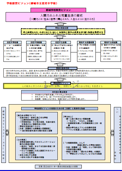 「学ぶ意欲をもち、心身ともにたくましく、主体的に自分の未来を切り拓く生徒を育成する」という本校の教育目標の実現に向けて、「心の教育と学力の向上を積極的に推進し、信頼される『魅力ある学校』を創造する」ことを経営ビジョンとして掲げ、生徒、保護者、地域の方々と学校が連携を密に図りながら、職員一丸となり取り組んでまいります。