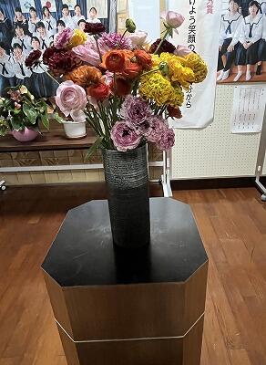 他にも、ありとあらゆる場所に飾らせていただきました。明日の入学式、2・3年生14名と、職員とたくさんの色とりどりのラナンキュラスのお花で新入生6名を迎えます。