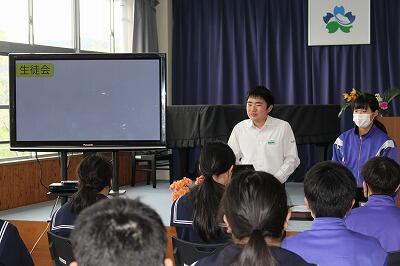 4月12日(金)生徒会オリエンテーションが行われました。生徒会長YHさん、書記・会計のTMさんがそれぞれ分担し、「生徒会とは?」ということから、生徒会活動、各専門委員会の活動について、スライドを見せながら、わかりやすく説明していました。スライドは、2人が春休みから時間をかけて準備してくれたものでした。とってもわかりやすかったですよ。本当におつかれさまでした。