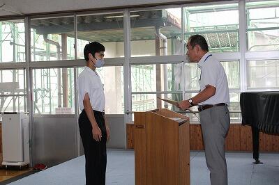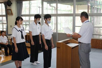 11月22日(金)生徒会役員任命式を行いました。旧役員への感謝状と記念品贈呈を行い、旧生徒会長のYさんが、「生徒会長として色々な経験を積み成長できた」とあいさつしました。次に新役員へ認証状を授与しました。新生徒会長Kさん、副会長TMさん、書記Tさんが緊張した面持ちで認証状を受け取りました。校長先生からは、「選んだ責任」「選ばれた責任」、「それぞれの立場で自分の果たすべき責任は何かを考え行動してほしい」とお話されました。
