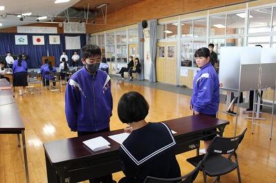 11月7日(木)生徒会役員選挙を行いました。次代のリーダーを決める大切な選挙。立会演説会の中では、4名の立候補者が緊張しながらも、堂々と自身の公約を述べました。演説が終わり、いよいよ投票。投票に入る前に選挙管理員会からの投票の仕方について丁寧な説明が行われました。そして、緊張感が漂う中、一人一人が思いをもって投票を行いました。