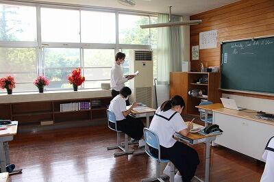今日はアレックス先生の訪問日です。英語の授業では今週の木曜日からの期末テストにむけて、文法の復習が行われていました。when, if, becauseの使い方についての復習です。ホワイトボードの(    )に適する語句を入れていくものでした。