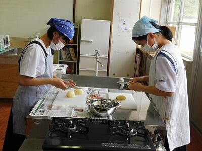 今日の1、2年生の家庭科の授業は次の時間のアップルパイ作りに備えて、リンゴの皮むきを行いました。リンゴの皮むき以外と難しいですね。生徒は真剣に取り組んでいました。上手にむけたかな?