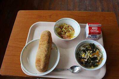 今日の給食は、きなこ揚げパン、牛乳、ウインナーと野菜のソテー、五目スープでした。今日はベジ活の日だそうです。M先生は「久しぶりに食べる揚げパンは昔を思い出す懐かしい味でした。」と言っていました。