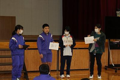 3月8日(金)生徒会の送別行事を行いました。学年対抗による贈る言葉作りゲーム(国語)、学校・先生方、生徒に関するクイズ(社会)、英語による借り物競走(英語)と、どのゲームも工夫されており、先生・生徒で大いに盛り上がりました。ゲームの後は、3年生へのメッセージと贈り物贈呈、3年生から1・2年生への言葉と続き、互いに感謝の気持ちを伝える温かい行事となりました。昼休み・放課後と遅くまで残りこの日の準備をしてくれたHさん、Mさん、Eさん、生徒会担当のT先生、本当にお疲れさまでした。あと1週間で3年生はこの学び舎を巣立っていきます。さみしいです。。。