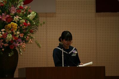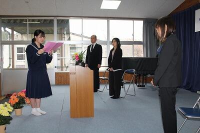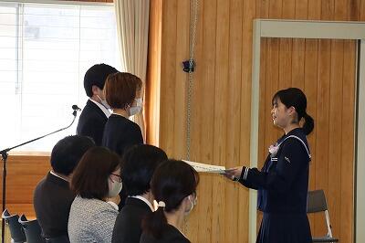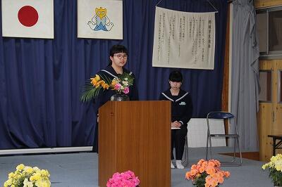 次に、始業式。新2年生のTMさんは、学校生活を豊かにするための大切なこととして、笑顔でいることとあいさつをはじめ、相手に自分の考えを伝えることをがんばりたいと抱負を述べました。