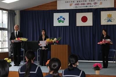 令和6年度のスタートです。まずは新任式。5名の新しい先生方をお迎えしました。生徒会役員のTMさんが歓迎のあいさつの中で、夏尾中ならではの行事を紹介してくれた後に、「みんなで今年もたくさんの思い出をつくりましょう!」とあいさつしました。