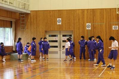 続いて全校生徒が円になって自己紹介。先生方も参加します。