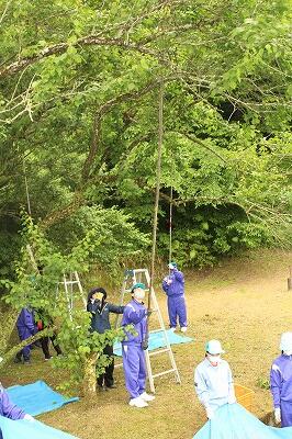 長い棒で、枝をゆすります