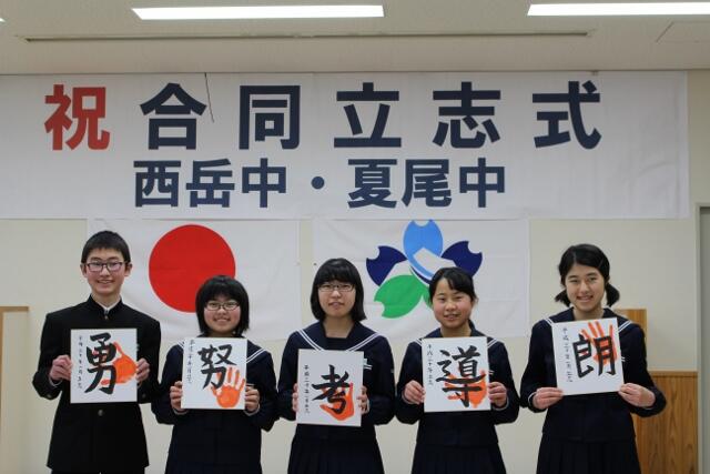 1月19日(金)に西岳中学校と合同で立志式が行われました。昨年度から西岳地区まちづくり協議会の協力を得て合同で開催されています。28名の来賓の皆様を迎え、夏尾中生徒5名、西岳中生徒6名が、「立志の誓い」を立派に発表してくれました。また、記念講演では、ホテルマリックスの日髙昭江様から「今、社会に求められる礼儀作法」~第一印象はまず形から~という演題で講演をいただきました。立志式を機会に、2年生全員が今後の学校生活を充実させてくれることを期待します。