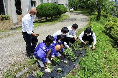 3年生が先日植えたピーマン、オクラ、しその草抜きをしました。誰の担当の野菜が一番成長するか楽しみです。