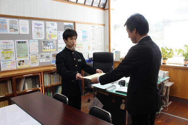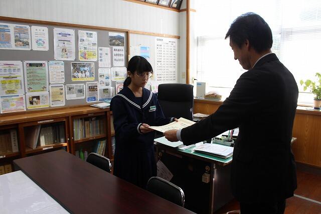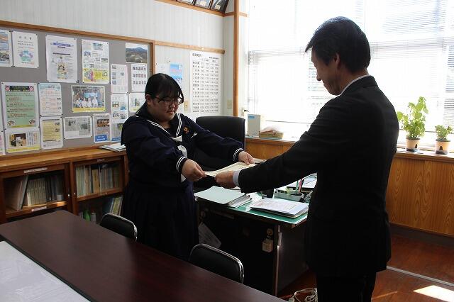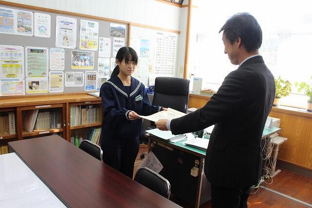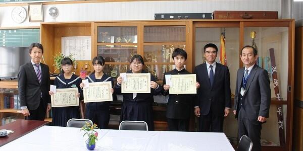 12月18日(木):都城地区租税教育推進協議会が主催する税についての中学生作文コンクールで入賞した生徒の表彰を、都城税務署 署長 寺本様に来校していただき実施しました。金賞1名・銅賞2名・都城地区税務協力団体連絡協議会会長賞1名に表彰状を授与していただきました。