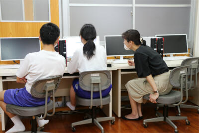 本日は、生徒たちは、運動会に向けて、団装飾の準備を6時間目に行いました。(パソコン室で図案の検討)