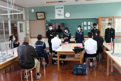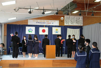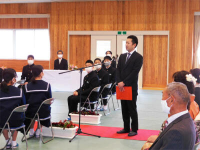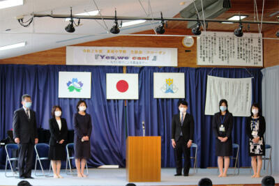 30日(火) 令和2年度の離任式を行いました。本年度は、本校職員から4名の先生方と、小学校の事務と養護教諭、計6名の離任となりました。どの先生方にとっても、夏尾小中学校での勤務は、忘れることのできない素晴らしい思い出になりましたし、自然豊かな環境と保護者や地域の方々からしっかりと学校が支えられていることも実感いたしました。