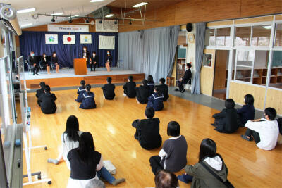 本日は、式の準備と練習、そして、3年生とのお別れ会を行いました。短い時間ではありましたが、1・2年生から花束贈呈やビデオメッセージなど、心のこもったお別れ会ができました。在校生、ありがとう!!!
