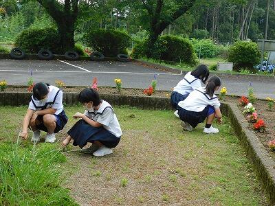 今日は朝の奉仕作業の日でした。朝から黙々と草取りをしてくれました。最後の写真は職員室前に植えている、なすびとミニトマトです。なすびは昨年は今一歩でしたが、ミニトマトは台風を何回もしのいで元気に成長してくれました。今年の収穫が楽しみです。