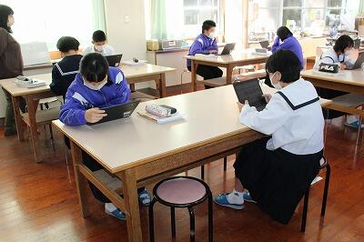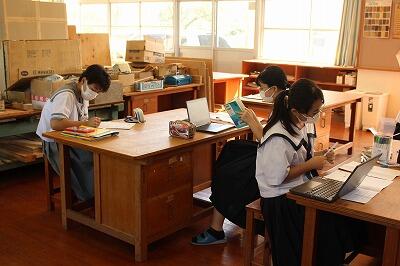 今日の1年生の美術の授業は図書ポップのデザインの授業でした。自分の気に入った本の紹介をするために、タブレットなどを活用しながらポップ作りを進めていました。